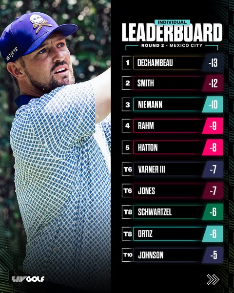 Joaquín Niemann protagonizó una destacada actuación durante la segunda ronda del LIV Golf México, firmando una tarjeta de 64 golpes (-7) en el Club de Golf Chapultepec que lo ubica en el tercer puesto individual con un acumulado de -10, a solo tres impactos del líder Bryson DeChambeau (-13).