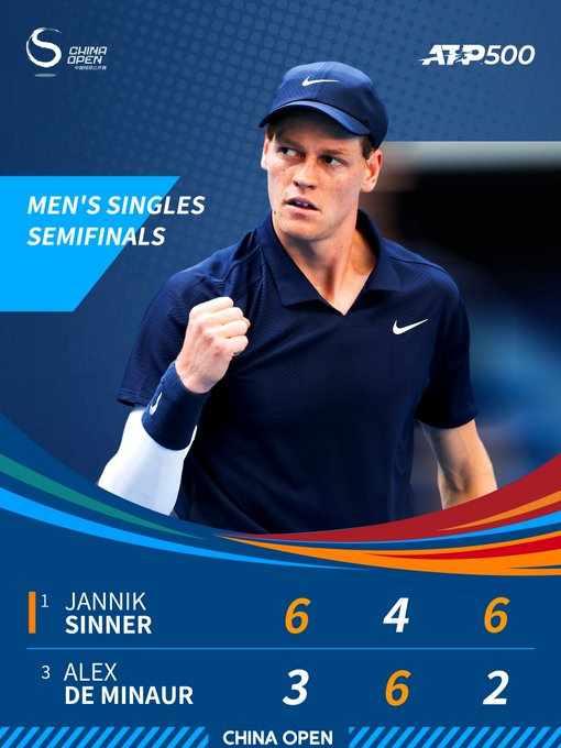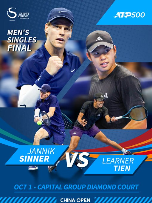 Con el objetivo de elevar el peso de la temporada, Sinner disputará la final del China Open ante el No. 52 mundial Learner Tien. El estadounidense, vigente subcampeón de las Next Gen ATP Finals presented by PIF, alcanzó su primera final ATP Tour tras la retirada por lesión de Daniil Medvedev, al que dominaba por 5-7, 7-5, 4-0 en el momento de la interrupción.