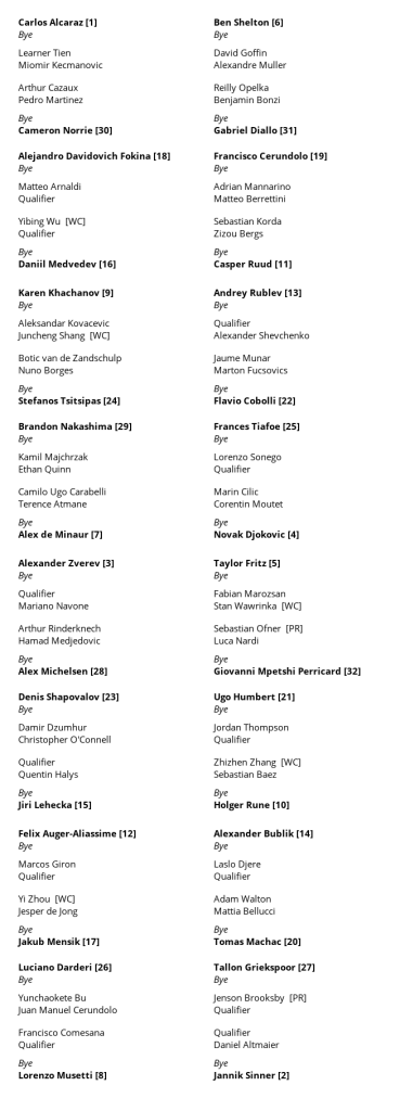 Este es el cuadro principal del ATP Masters 1000 de Shanghái 2025: