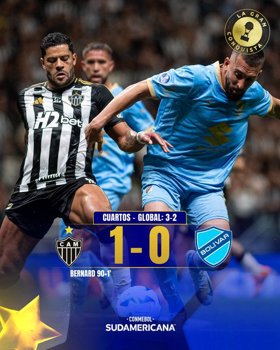 Atlético Mineiro derrotó 1-0 a Bolívar y puso su nombre en las semifinales de la Copa Sudamericana. Un cabezazo de Bernard —in extremis— le dio al Atlético Mineiro el gol con el que se clasificó para las semifinales de la Copa Sudamericana 2025, en la que espera por el ganador del partido entre Once Caldas vs Independiente del Valle.