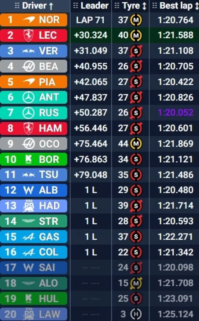 Por detrás, Piastri luchó durante muchas vueltas con Tsunoda por la 8ª posición, que a mitad de carrera se convirtió en 7ª por la sanción a Hamilton. Eso no frenó al de McLaren, que vio como no solo se enfrentaba a un Mercedes, si no que Antonelli se quedaba por debajo del segundo de diferencia de Russell, por lo que el DRS que este le daba en las rectas imposibilitaba los adelantamientos de Piastri.