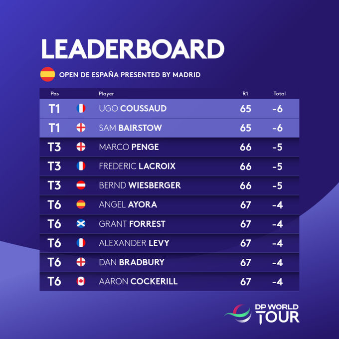 La lucha por el liderato quedó en manos del francés Ugo Coussaud, quien firmó un sólido 65 (-6), seguido de cerca por un grupo de cuatro jugadores que cerraron la jornada con 66 impactos (-5), entre ellos Bernd Wiesberger y Marco Penge.