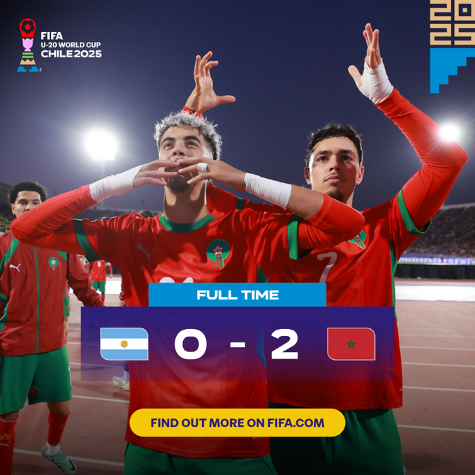 Estadística: Marruecos se convirtió en el primer equipo en 42 años en vencer a Argentina en una final de la Copa Mundial Sub-20 de la FIFA. Desde que Jorginho, Dunga, Geovani, Bebeto y Brasil ganaron 1-0 en la final de México 1983, Argentina se había vengado de sus archienemigos y superó a Uruguay, Ghana, Nigeria y República Checa para alzar el trofeo.