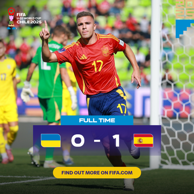 Un gol de Pablo García en el primer tiempo fue suficiente para que España superara a Ucrania y alcanzara los cuartos de final de la Copa Mundial Sub-20 de la FIFA Chile 2025. Ahora, el equipo europeo espera al ganador del partido entre Colombia y Sudáfrica, por los cuartos de final.