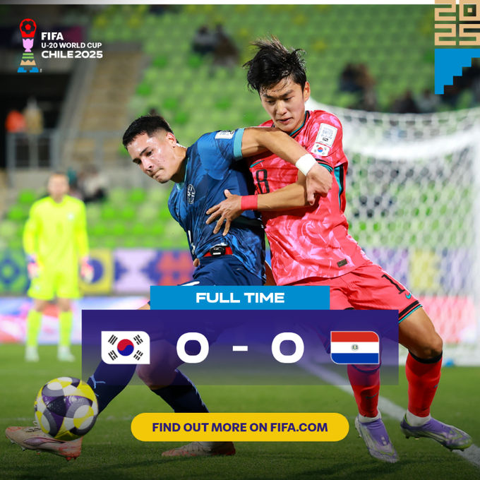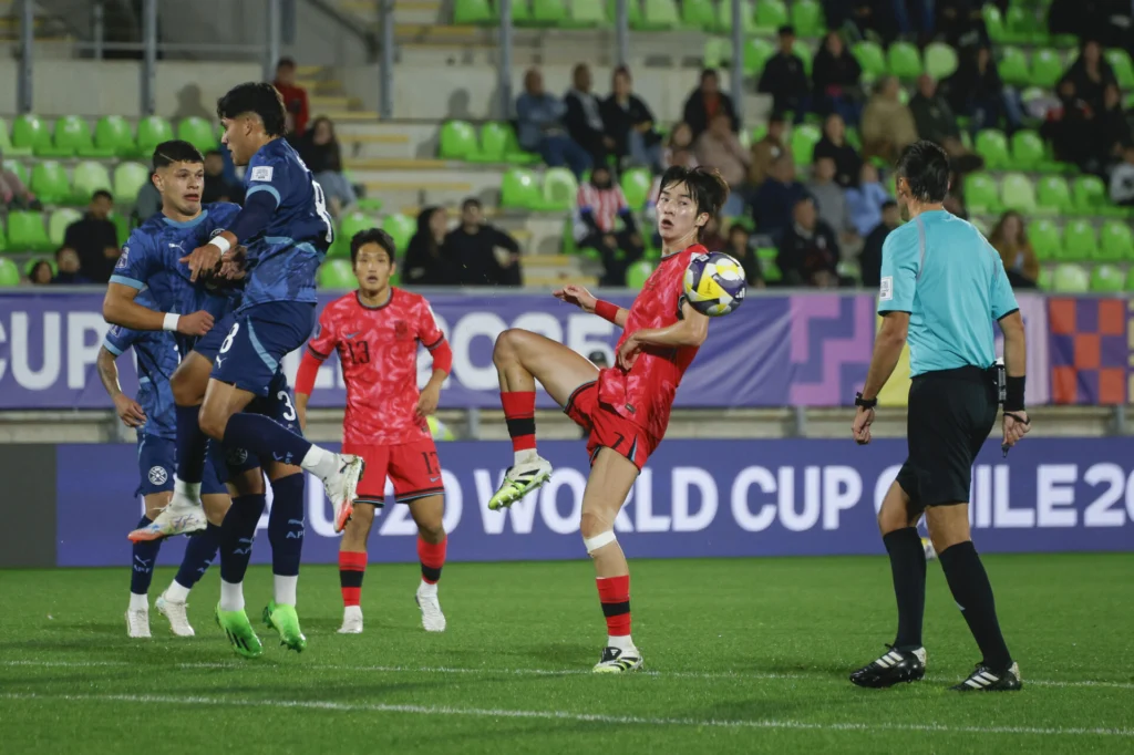 La República de Corea quedó frustrada al tener que conformarse con un punto contra diez jugadores de Paraguay. Los sudamericanos empezaron bien y casi se adelantan, cuando Alexandro Maidana remató de volea apenas desviado y poco después, un cabezazo del capitán Lucas Quintana fue negado sobre la línea. Sin embargo, la expulsión de Enso González frenó el impulso de Paraguay al filo del descanso tras la revisión del árbitro por una patada sobre Kim Hyeonoh.