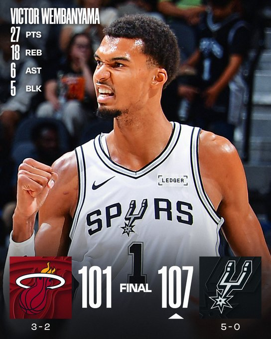 Victor Wembanyama firmó una noche histórica con 27 puntos, 18 rebotes, 6 asistencias y 5 tapas para que San Antonio lograra su primer 5-0 inicial en la historia. Stephon Castle acompañó con 21 puntos y 8 asistencias, mientras que Bam Adebayo lideró a Miami con 31 y 10 rebotes. Los Spurs cerraron con un 8-3 final para sostener su invicto.