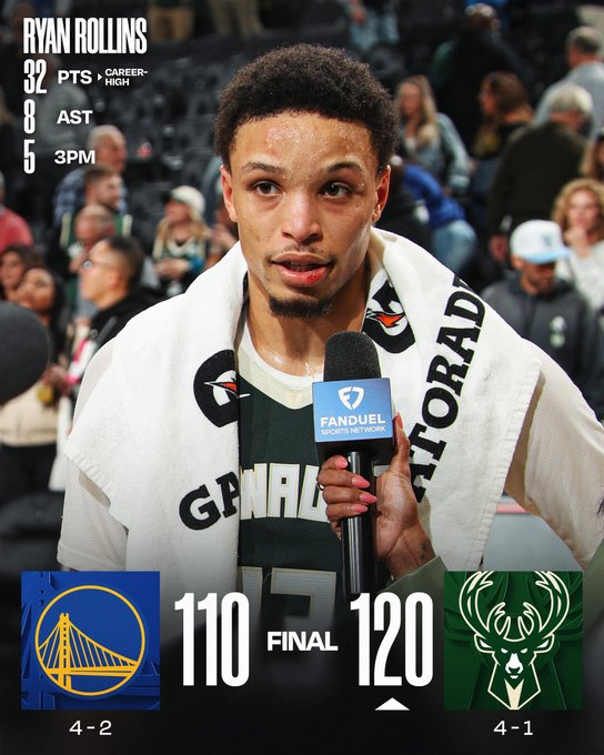 Ryan Rollins volvió a brillar con 32 puntos (13/21 en tiros y 5/7 en triples) y 8 asistencias, llevando a Milwaukee al triunfo pese a la ausencia de Giannis Antetokounmpo. Stephen Curry anotó 27, Jonathan Kuminga 24 y Jimmy Butler 23 con 11 rebotes para Golden State. Rollins selló la victoria con un triple final tras un parcial 11-2 en los últimos minutos.