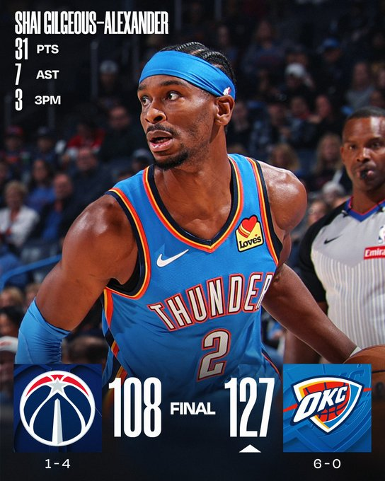 Shai Gilgeous-Alexander sumó 31 puntos y Oklahoma City se mantuvo invicto (6-0), con un sólido aporte del banco: Ajay Mitchell metió 20 y Isaiah Joe también 20 en su regreso, con cinco triples. El Thunder forzó 22 pérdidas y volvió a imponer su ritmo pese a las bajas de Holmgren y Jalen Williams. Washington cayó a 1-4.