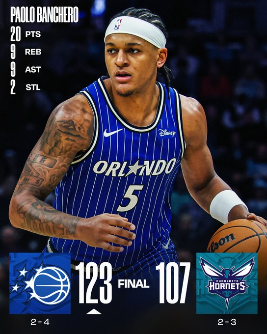 Franz Wagner lideró con 21 puntos y Paolo Banchero rozó el triple-doble (18 puntos, 9 rebotes y 9 asistencias) para que Orlando cortara una racha de cuatro derrotas. LaMelo Ball aportó 17 puntos y 13 asistencias, pero Charlotte, que alineó por primera vez a tres rookies titulares, no pudo sostenerse en el cierre. Orlando firmó su mejor primera mitad de la temporada con 71 puntos.