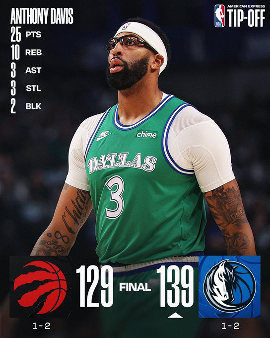 Dallas consiguió su primera victoria al imponerse sobre Toronto. Anthony Davis fue la gran figura del encuentro con 25 puntos y 10 rebotes. En los Raptors se destacó Scottie Barnes, con 33 tantos y 11 rebotes.