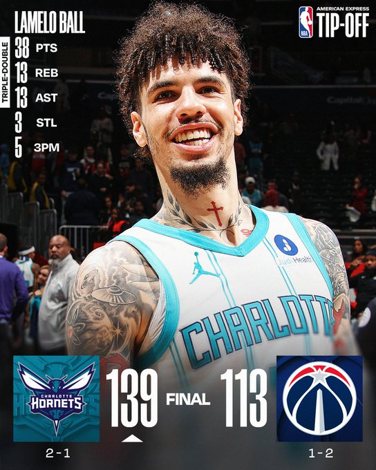 Charlotte jugó un gran partido y sumó su segunda victoria de la temporada tras vencer con autoridad a Washington. LaMelo Ball brilló con un triple-doble monumental: 38 puntos, 13 rebotes y 13 asistencias.