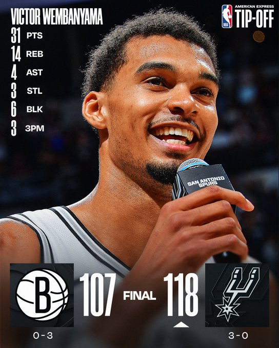 San Antonio confirmó su gran inicio de temporada al sumar una nueva victoria frente a Brooklyn. Victor Wembanyama volvió a lucirse con 31 puntos y 14 rebotes. En los Nets, Cam Thomas se destacó con 40 unidades.