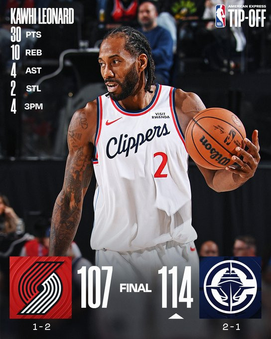 Kawhi Leonard tuvo 30 puntos y diez rebotes y los Clippers de Los Ángeles vencieron 114-107 a Portland el domingo por la noche en el segundo partido de los Trail Blazers desde que el entrenador en jefe Chauncey Billups fue arrestado por cargos de apuestas.Billups y el jugador del Heat de Miami Terry Rozier estuvieron entre los arrestados el jueves por lo que funcionarios federales de la ley describieron como su participación en actividades de apuestas ilícitas.