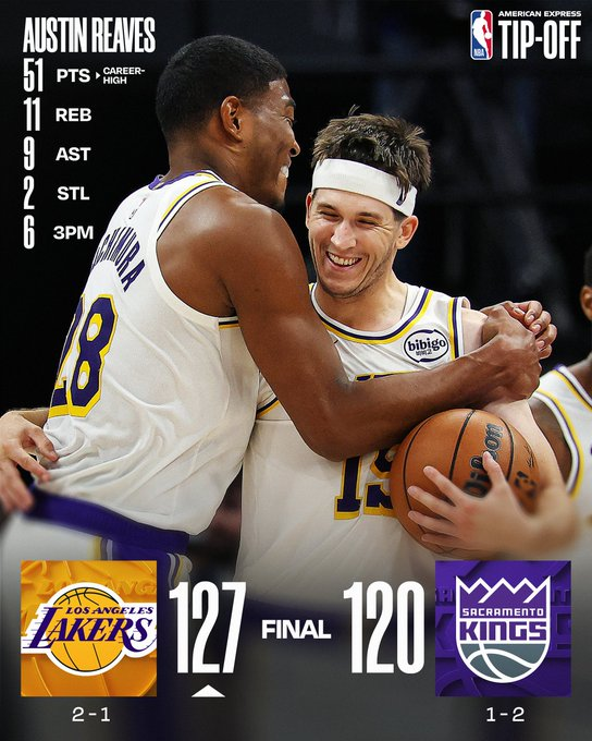 Sin él, Austin Reaves vivió la mejor noche anotadora de su carrera, con 51 puntos (12 de 22 en tiros de campo, 6 triples y 21 de 22 desde la línea de libres), 10 rebotes y 9 asistencias. Sus compañeros corrieron a abrazarlo entre risas apenas finalizó el encuentro de Sacramento.