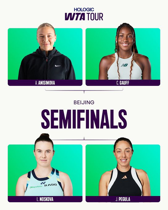 La checa Linda Noskova alcanzó su primera semifinal WTA 1000 en el Abierto de China en Beijing con una victoria en dos sets sobre convirtiéndose en la checa más joven en lograrlo desde 2009. A continuación se enfrentará a la Jessica Pegula quien superó a su amiga y compatriota Emma Navarro.