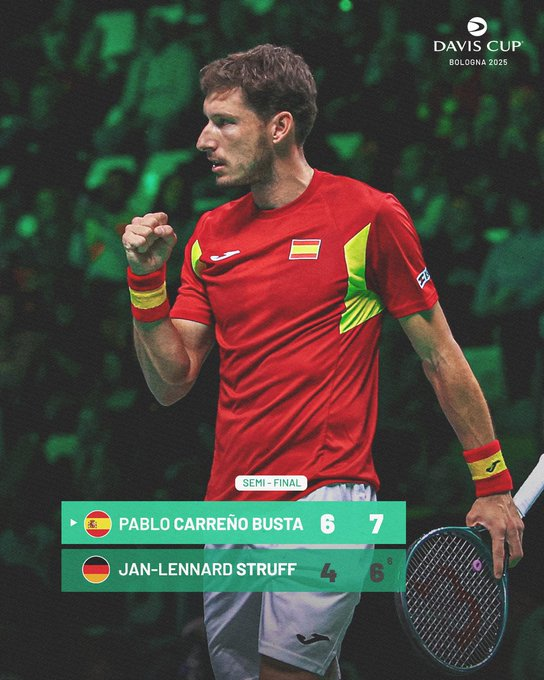 España dio el primer paso hacia la final de la Copa Davis. En el partido inaugural de la eliminatoria contra Alemania el sábado, en la semifinal del torneo, el ex top 10 y actual número 89 del mundo Pablo Carreño Busta derrotó a Jan-Lennard Struff, 84.º del ranking, por 6-4, 7-6 (8-6) en 1 hora y 44 minutos.