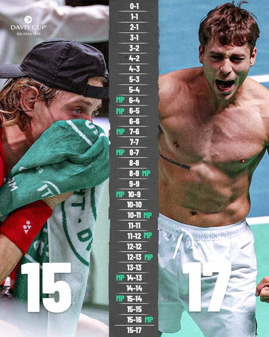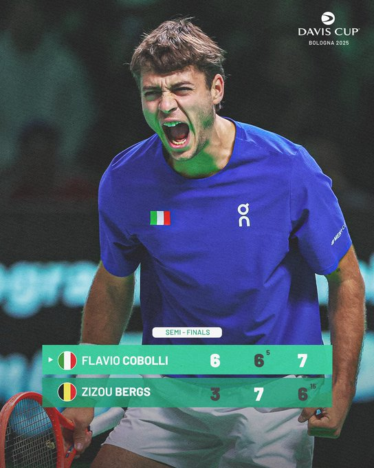 En un ‘tie-break’ para el recuerdo, con resultado final de 17 a 15 y en un partido en el que ambos gozaron de 7 bolas de partido, Flavio Cobolli regaló a Italia la inmensa alegría de repetir final en Copa Davis por tercer año consecutivo al prevalecer ante Zizou Bergs (6-3, 6-7(5) y 7-6(15)).