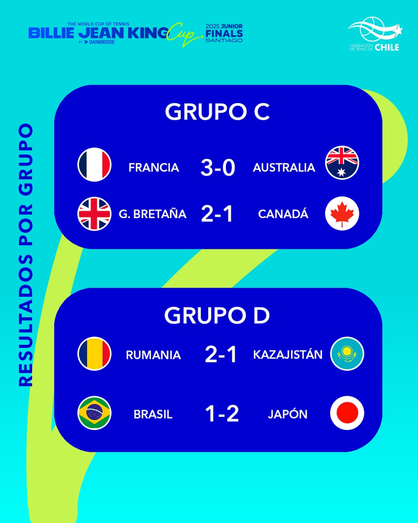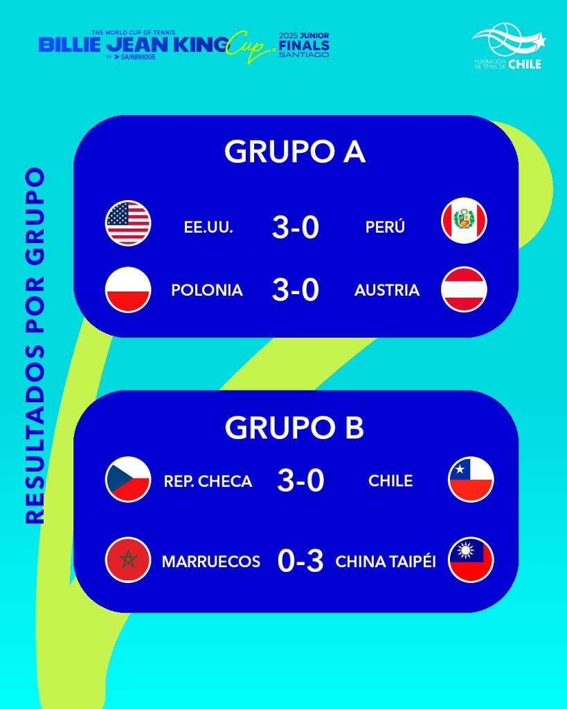 Ayer martes continuó la acción del Mundial Sub-16 Santiago 2025, con el desarrollo de la segunda jornada de la Billie Jean King Cup by Gainbridge Junior Finals y la Davis Cup Junior Finals, que se disputan en el Centro de Tenis y Raquetas del Parque Estadio Nacional.