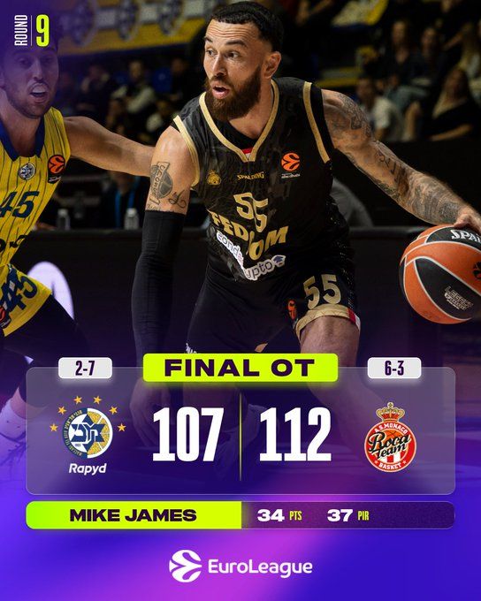 El Mónaco consiguió su tercera victoria consecutiva en la Euroliga el jueves por la noche tras vencer al Maccabi 107-112 en la tanda de penaltis. Mike James fue una fuerza imparable en ataque, anotando 15 puntos en los últimos 15 minutos y terminando con 34, su mejor marca en la Euroliga desde 2021. En la prórroga, Elie Okobo también fue clave para el Mónaco, anotando 7 puntos y repartiendo 2 asistencias. Con esta victoria, el Mónaco mejora su balance a 6-3, mientras que el Maccabi cae a una marca de 2-7.