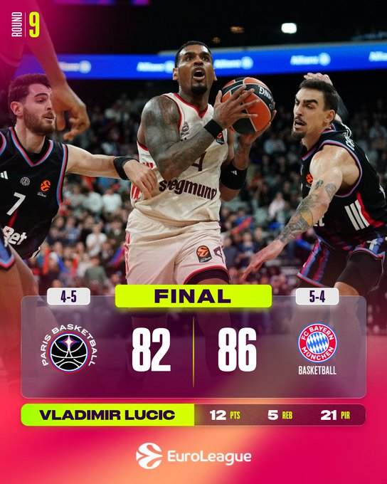 El FC Bayern Munich consiguió su tercera victoria consecutiva al vencer por la mínima a Paris Basketball por 82-86 el jueves por la noche en el Adidas Arena. Los visitantes tuvieron un buen comienzo y llegaron al segundo cuarto con una ventaja de 19-22, donde superaron a Paris por 23-31 para establecer una ventaja de dos dígitos (42-53) al descanso.