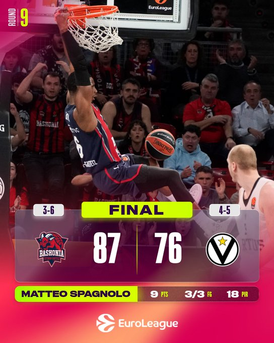 El Baskonia Vitoria-Gasteiz consiguió su tercera victoria consecutiva al vencer al Virtus Bologna por 87-76 en el Buesa Arena, en la jornada 9 disputada el jueves. Tras un inicio de 0-6, el peor arranque de su historia en la Euroliga, el Baskonia ahora tiene un balance de 3-6 en la clasificación. El Virtus cayó a 4-5 y acumula tres derrotas consecutivas, todas ellas a domicilio.