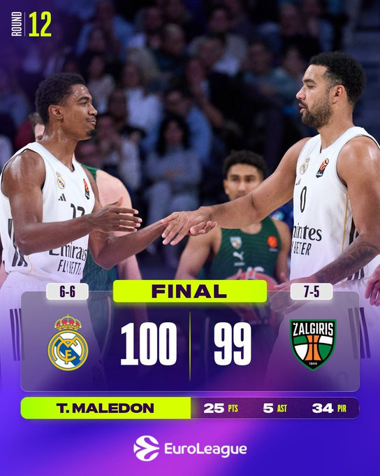 En un emocionante partido que se decidió en el último segundo, el Real Madrid se recuperó al vencer al Zalgiris Kaunas por 100-99 en la jornada 12 el jueves. El Real Madrid mejoró su balance a 6-6 en la clasificación, mientras que el Zalgiris cayó a 7-5. Todo se decidió en los últimos 2,5 segundos, en los que Facu Campazzo falló dos tiros libres, el segundo a propósito para agotar el tiempo. El Zalgiris tuvo una oportunidad a tiempo, pero el triple de Ignas Brazdeikis desde más allá de la media cancha no entró.