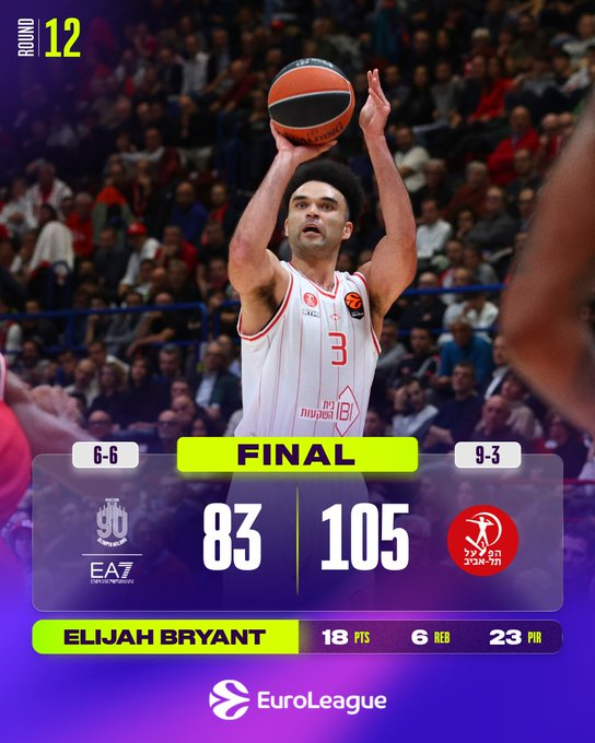 Hapoel continuó su buena racha y se mantuvo en la cima de la tabla con una contundente victoria por 83-105 en Milán, en un partido donde los visitantes ofrecieron un juego vibrante en el Unipol Forum. Aprovechando su característico juego de pick-and-roll, Hapoel remontó una desventaja de 30-25 en el segundo cuarto para ponerse arriba 36-42, con Dan Oturu dominando la pintura de Milán. El marcador era de 45-49 al descanso, y Hapoel inició la segunda mitad con una racha de 0-12 para luego cerrar el tercer cuarto con una ventaja de 64-76, mientras que Milán tuvo dificultades para seguir el ritmo del equipo israelí.