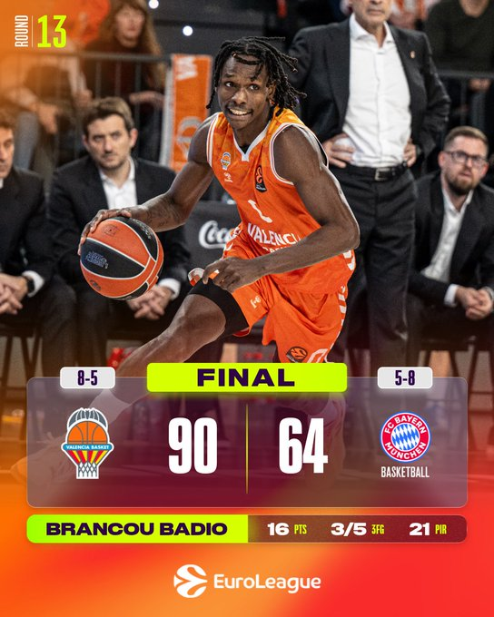 El Valencia se impuso en el tercer cuarto por 27-12 y Brancou Badio lideró el marcador con 16 puntos, mientras que Jean Montero y Omari Moore anotaron 13 puntos cada uno y Darius Thompson aportó 12 puntos y 4 asistencias. El Bayern ha perdido cuatro partidos seguidos, tras tres victorias consecutivas, para un récord de 5-8. Este fue el tercero de siete partidos consecutivos como visitante para el Bayern, liderado por Spencer Dinwiddie con 12 puntos.