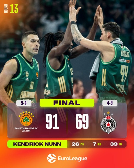El equipo local se alejó aún más con Kendrick Nunn anotando 8 puntos consecutivos en un parcial de 21-0 en el tercer cuarto, decidiendo fácilmente el resultado. Los Verdes mejoran su marca a 9-4, mientras que el Partizan cae a 4-9.