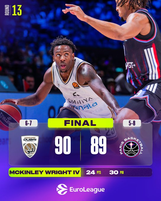 En el último minuto, un triple de Justin Anderson y cuatro tiros libres de Wright pusieron a Dubái 90-86 por delante, antes de que Nadir Hifi anotara un triple en la última jugada del partido para fijar el 90-89. París cayó a 5-8 con esta derrota, su segunda consecutiva.