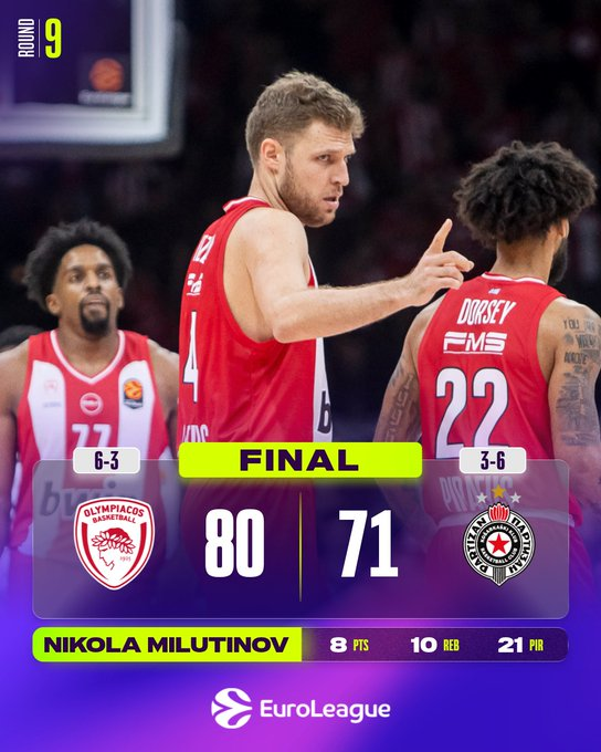 El Olympiacos consiguió su cuarta victoria en cinco partidos al derrotar al Partizan por 80-71 el viernes por la noche en el Estadio de la Paz y la Amistad. Una primera mitad muy disputada, con 16 cambios de liderazgo, permitió a los visitantes llegar al descanso con una ventaja de 38-39. Partizan inició la segunda mitad con una racha de 0-8 y llegó al último cuarto con una ventaja de 53-58. Sin embargo, Olympiacos cerró el partido con una racha de 11-0 y limitó a los visitantes a solo 13 puntos para asegurar la victoria. Los Rojos mejoraron su récord a 6-3, mientras que Partizan cayó a 3-6.