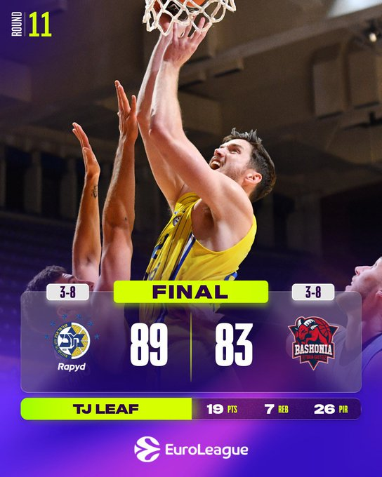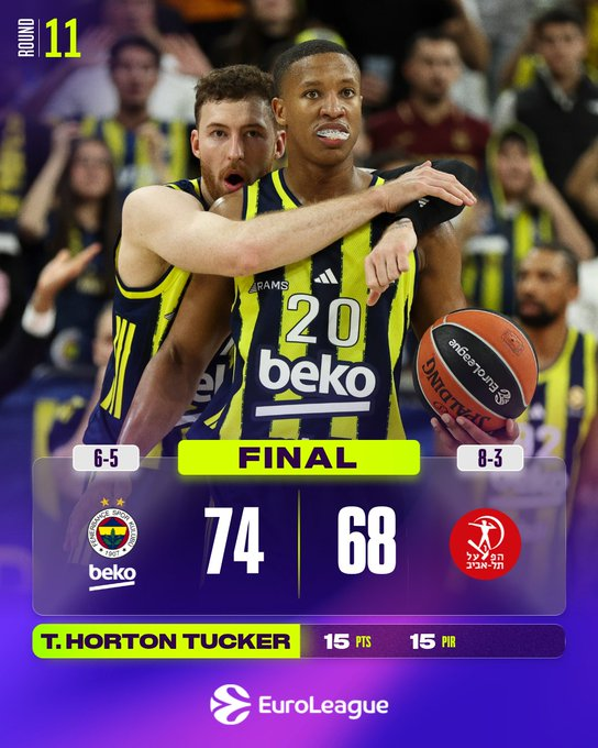 Talen Horton-Tucker lideró al Fenerbahçe con 15 puntos, mientras que Devon Hall aportó 14. Bonzie Colson y Tarik Biberovic anotaron 10 puntos cada uno y Nicolo Melli capturó 10 rebotes. Elijah Bryant lideró al Hapoel con 19 puntos, seguido por Johnathan Motley con 14 y Vasilije Micic con 11. El Fenerbahçe mejora su balance a 6-5 con su tercera victoria consecutiva, mientras que el Hapoel cae a 8-3.
