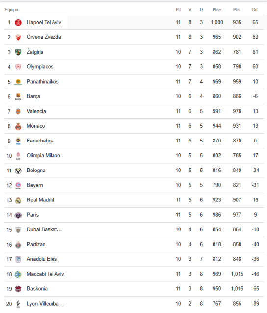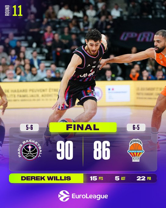 El Paris Basketball puso fin a una racha de cuatro derrotas consecutivas al remontar y vencer al Valencia Basket 90-86 en casa en la jornada 11 el jueves. El Paris mejoró su balance a 5-6 en la clasificación, mientras que el Valencia cayó a 6-5. El Valencia ganaba 79-86 a falta de menos de 3 minutos, pero Jeremy Morgan, Nadir Hifi y Sebastián Herrera anotaron triples en una racha final de 11-0 que le dio la victoria al Paris.