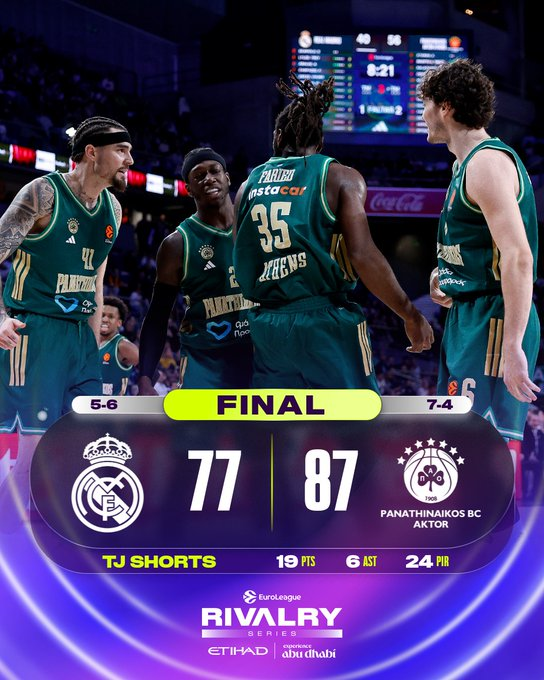 El Panathinaikos AKTOR Atenas completó una semana perfecta a domicilio al vencer al Real Madrid por 77-87 en el Movistar Arena el jueves por la noche. Los visitantes dominaron desde el inicio y lideraron de principio a fin, con TJ Shorts y Kostas Sloukas marcando el ritmo y Kenneth Faried dominando en la pintura en apenas su segundo partido con los Verdes.