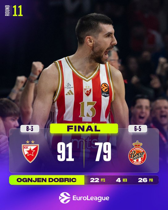 El Crvena Zvezda Meridianbet Belgrado recuperó el liderato tras una merecida victoria en casa por 91-79 sobre el Mónaco. Este resultado eleva el balance de los ganadores a 8-3 y deja al Mónaco con 6-5 tras su segunda derrota consecutiva en la capital serbia, después de la dramática derrota del martes por 78-76 ante el Partizan Mozzart Bet Belgrado.