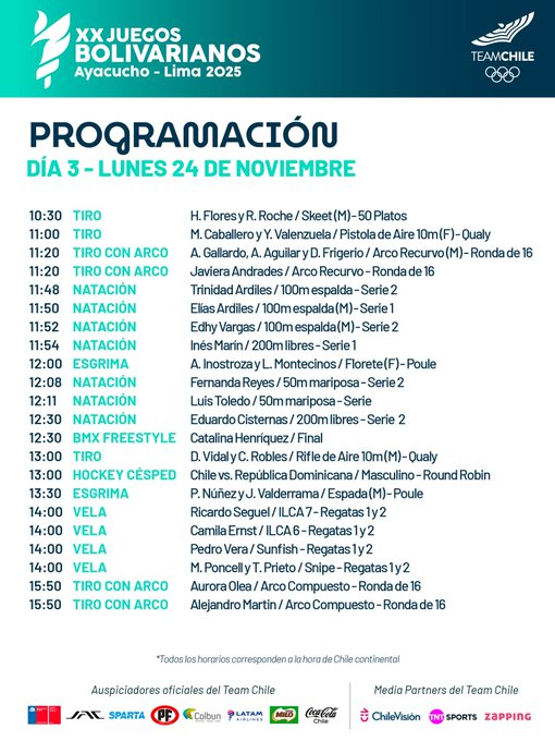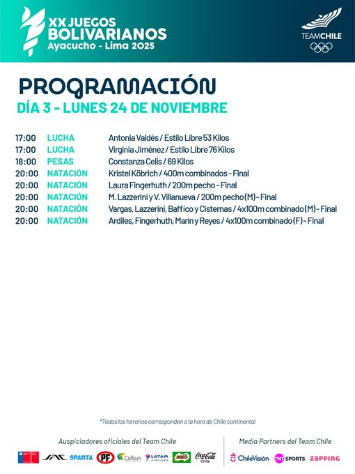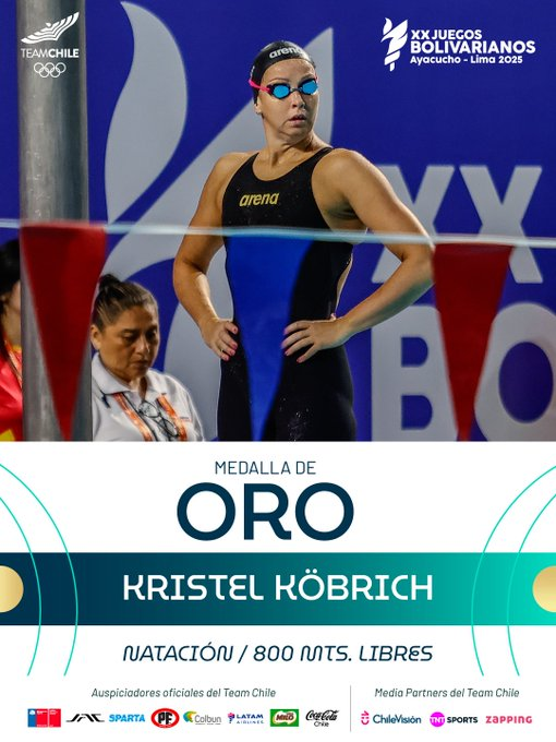 El Team Chile tuvo una notable jornada en los Juegos Bolivarianos Ayacucho – Lima 2025, tras la gran cosecha lograda por la natación, deporte que sumó seis preseas (tres de oro, una plata y dos bronces) en el Centro Acuático de la Villa Deportiva Nacional (VIDENA). La producción fue liderada por la incombustible Kristel Köbrich (40 años), quien sumó su tercer oro en Juegos Bolivarianos (ocho medallas en total) y el trigésimo primer metal considerando Juegos Suramericanos y Juegos Panamericanos.