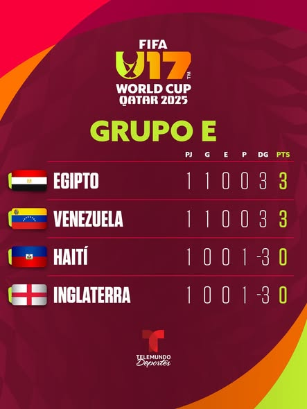 Egipto, con diez jugadores, aguantó y se llevó un punto ante Venezuela. Los sudamericanos se adelantaron cuando el capitán Marcos Maitán logró librarse de su marcador y remató de cabeza un córner desde el segundo palo. Egipto respondió con un cabezazo poco después del descanso, cuando Hamza Abdelkarim remató de cabeza un centro milimétrico de Mohanad El Shamy.