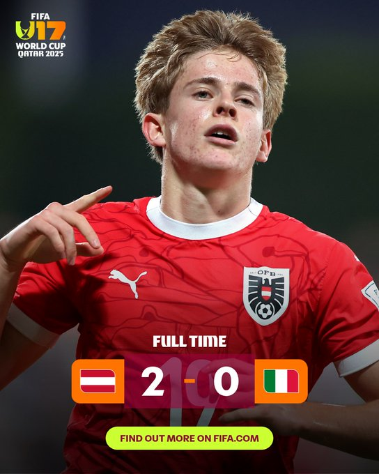 Johannes Moser marcó un brillante doblete y Austria venció a Italia, asegurándose así un puesto en la final de la Copa Mundial Sub-17 que se disputará el jueves. El centrocampista ofensivo anotó su séptimo y octavo gol en el torneo, lo que le valió a su equipo una épica victoria.