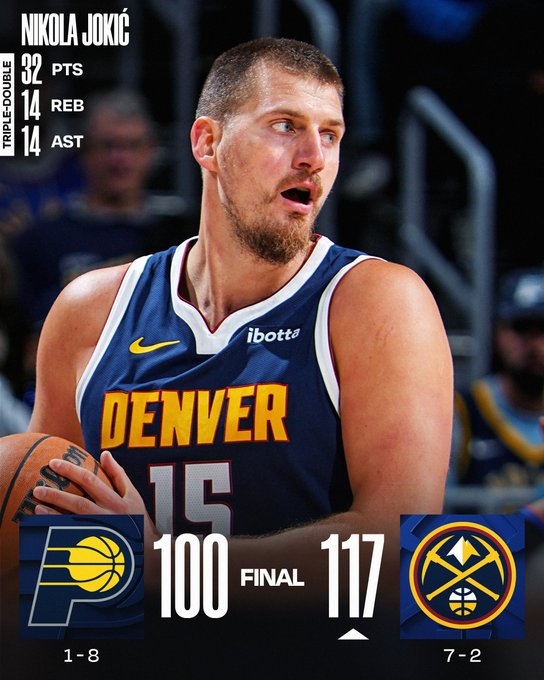 Nikola Jokic sumó otro triple-doble con 32 puntos, 14 rebotes y 14 asistencias, su sexto en nueve juegos, para guiar el triunfo de Denver. Sin Jamal Murray ni Aaron Gordon, los Nuggets se apoyaron también en Peyton Watson, que aportó 16 puntos como titular. Aaron Nesmith fue lo más destacado de Indiana con 25 tantos, pero el equipo no pudo sostener su intento de remontada.