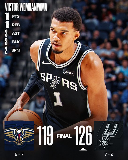 De’Aaron Fox volvió con 24 puntos en su debut de temporada y Victor Wembanyama dominó con 18 puntos y 18 rebotes en la victoria de los Spurs. Stephon Castle repartió 14 asistencias, mientras que Trey Murphy III fue el goleador de la noche con 41 para unos Pelicans sin Zion ni Poole. San Antonio impuso ritmo desde el inicio y nunca perdió la ventaja tras un gran primer cuarto.