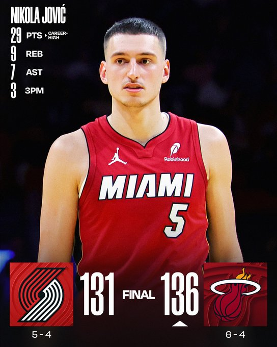 Nikola Jovic salió desde el banco para romper su marca personal con 29 puntos, nueve rebotes y siete asistencias en el ajustado triunfo de Miami. Norman Powell sumó 22 y Jaime Jaquez Jr. rozó el triple-doble con 14, 12 y 7, mientras que Deni Avdija brilló con 33 tantos para Portland. El duelo se definió en los minutos finales con un triple de Wiggins.