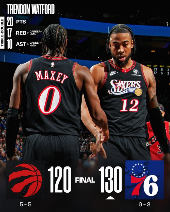 Tyrese Maxey sumó 31 puntos y Joel Embiid 29 para comandar la victoria de los Sixers, que rompieron su mala racha ante Toronto. Trendon Watford completó un triple-doble con 20 puntos, 17 rebotes y 10 asistencias, mientras que RJ Barrett y Immanuel Quickley aportaron 22 cada uno para los Raptors.