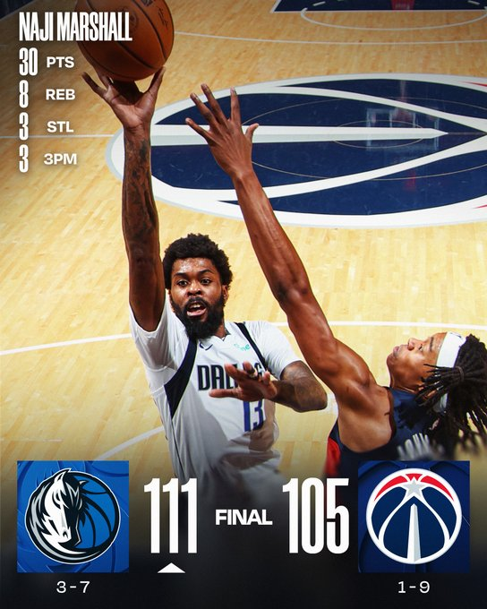 Naji Marshall firmó su mejor actuación de la temporada con 30 puntos para liderar el triunfo de Dallas, cortando una racha de cuatro derrotas. P.J. Washington apareció en el cierre con 8 tantos decisivos y 15 en total, mientras que CJ McCollum anotó 25 para unos Wizards que perdieron su octavo juego seguido. Dallas, sin Anthony Davis ni Klay Thompson, llegó a sacar 12 de ventaja en el primer cuarto antes de resistir la remontada local.
