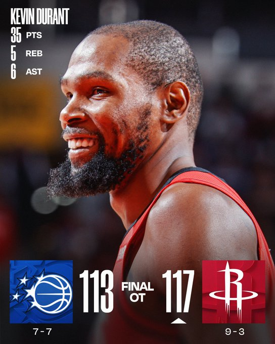 Houston le ganó en tiempo suplementario al Magic en un gran juego. El protagonista del partido fue Kevin Durant, con 35 tantos, 6 asistencias y 5 rebotes para el elenco texano, que sigue entre los primeros puestos del Oeste.
