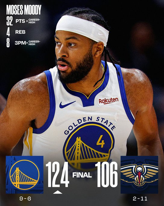 La jornada largó con una gran victoria de los Warriors, que siguen tomando confianza y trepando en la Conferencia Oeste. El elenco de Steve Kerr se impuso ante unos golpeados Pelicans. El mejor del encuentro fue Moses Moody, con 32 puntos y 4 rebotes.