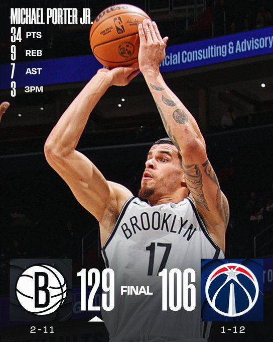 Seguimos con la importante victoria de los Nets ante los Wizards, en un duelo entre dos de los peores equipos del Este. Michael Porter Jr. dio la cara por el elenco ganador y sumó 34 puntos, 9 rebotes y 7 asistencias.