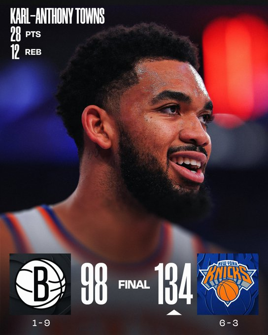 Los Knicks no tuvieron mayores problemas para ganarle al otro equipo de la ciudad. Fue victoria de los de naranja y azul en el Madison. Karl-Anthony Towns se erigió como la figura con 28 puntos y 12 rebotes.