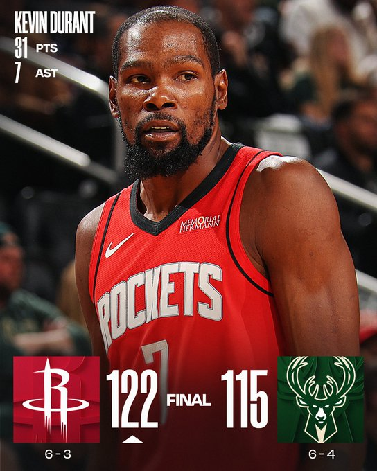KD fue la figura en los Rockets ante Milwaukee y por su parte Detroit no frena su andar en un domingo de solo siete partidos