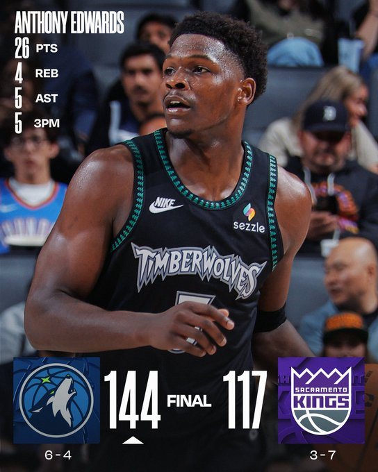 Anthony Edwards anotó 26 puntos, capturó cuatro rebotes, repartió cinco asistencias, robó dos balones y lideró a los Timberwolves de Minnesota a una victoria de 144-117 sobre los Kings de Sacramento la noche del domingo.Edwards lanzó siete de 16 desde el campo, cinco de 11 desde la línea de tres puntos e hizo siete de ocho tiros libres