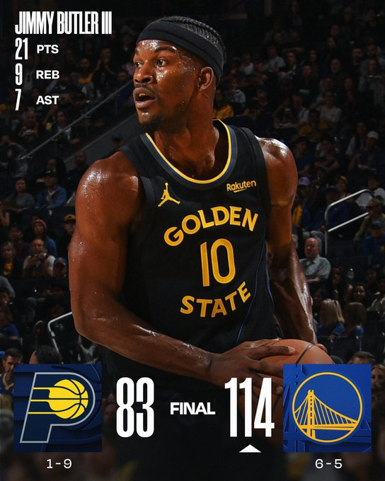 Jimmy Butler anotó 21 puntos, capturó nueve rebotes y repartió siete asistencias, Quinten Post contribuyó con 14 unidades y siete rebotes, y los Golden State Warriors vencieron 114-83 a los diezmados Indiana Pacers la noche del domingo. Stephen Curry se perdió su tercer partido consecutivo debido a un fuerte resfriado y había sido listado como dudoso por enfermedad.